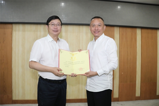 蹇宏(右)為(wèi)蔡開(kāi)雲(左)送來(lái)輪值會(huì)長(cháng)聘書(shū)