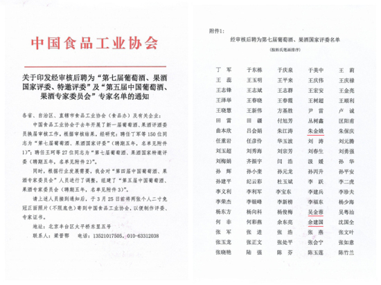 近(jìn)日(rì),從(cóng)中國(guó)食品工(gōng)業(yè)協會(huì)傳來(lái)喜訊,房縣野人泉酒業有限公司第六屆葡萄酒、果酒國(guó)家(jiā)評委朱金(jīn∏)娥、吳金(jīn)蓉、餘建國(guó)以優異的(de)成績通(tōng)過換屆考評,獲聘第七屆葡萄酒、果酒國(guó₽)家(jiā)評委。