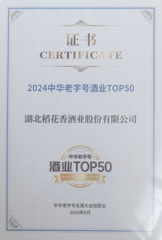 【概要(yào)描述】8月(yuè)23日(rì),第八屆中華老(lǎo)字号(山(shān)東(dōng))博覽會(huìγ)開(kāi)幕之際,中華老(lǎo)字号名酒大(dà)會(huì)在濟南(nán)成功召開(kāi),會(huì)上★(shàng)發布“2024 中華老(lǎo)字号酒業(yè)TOP50” 榜單,稻花(huā)香酒業(yè)公司榜上(shàng)有(yǒu)名,獲得(de)“2024 中華老(lǎo)字号酒業( yè)TOP50”榮譽。