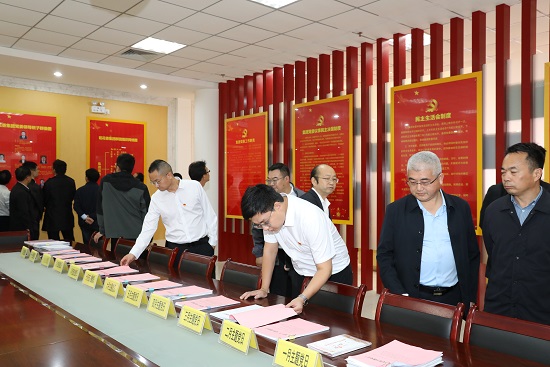 方麗(lì)華向李超(前排右三)介紹稻花(huā)香特色黨建情況