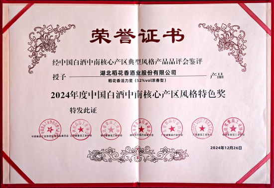 稻花(huā)香52度活力星榮獲中國(guó)白(bái)酒中南(nán)核心産區(qū)風(fēng)格特色獎